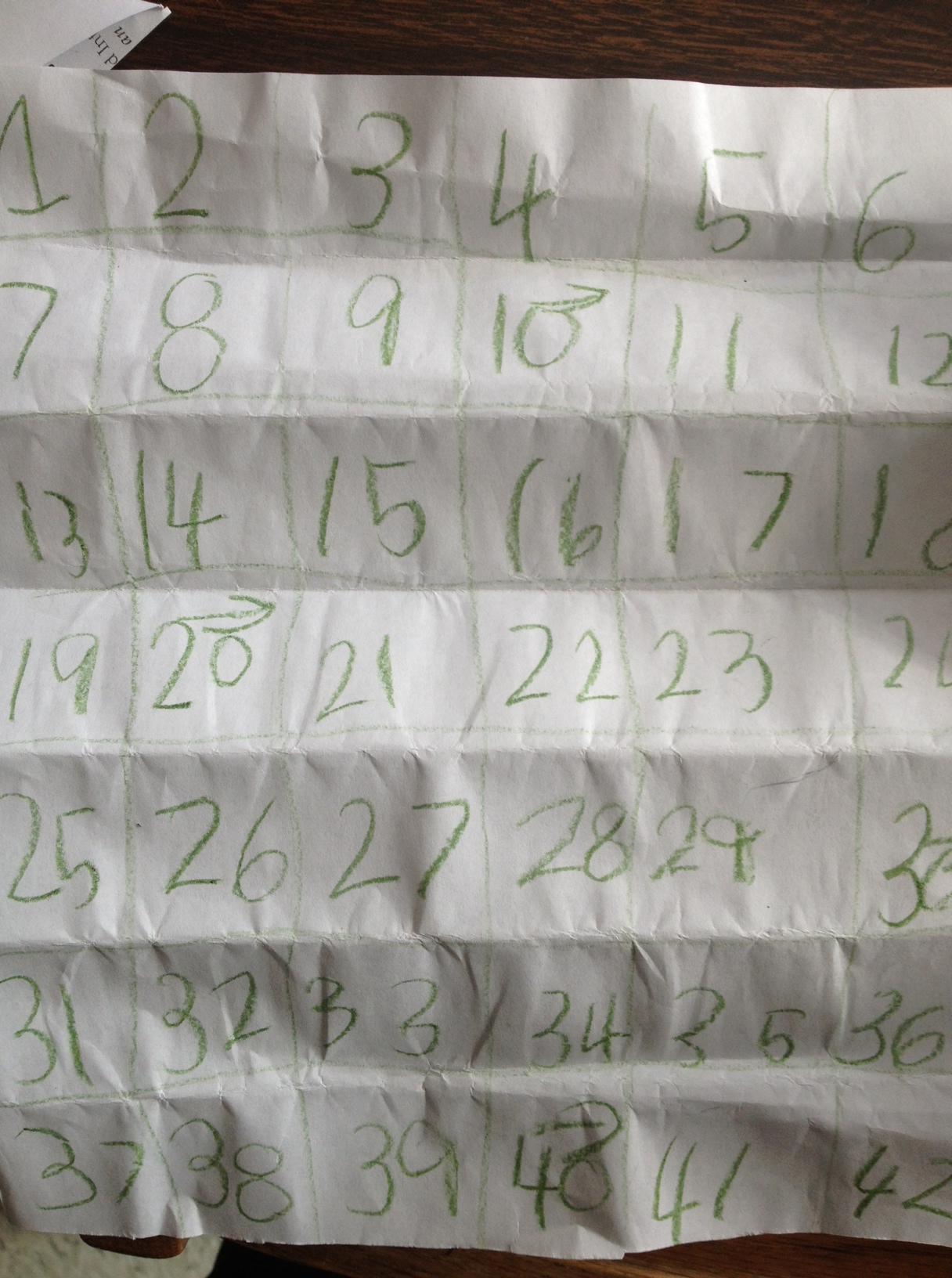 Allison folded up the paper and then numbered the squares. We noticed there were 6 boxes going across and 7 boxes going down to make all together 42 boxes. Can you fold paper and count the boxes?