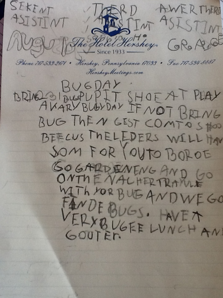 “Bring 2 or 3 or 1 bugs. Puppet show at Play: ‘A Very Buggy Day.’ If not bring bug, then just come to school because the leaders will have some for you to borrow. Go gardening and go on the nature trail with your bug and we go find bugs have a very buggy lunch and gouter all day.”